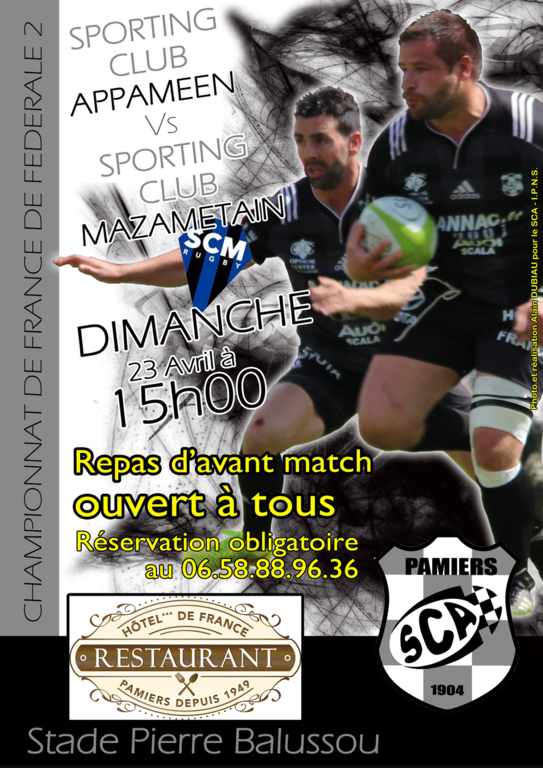 Comme d'habitude, le SCA vous propose son repas d'avant match (réservation obligatoire au 06.58.88.96.36) et vous donne rendez vous pour l'apéritif à 11h30 et le repas à 12h30 précises.