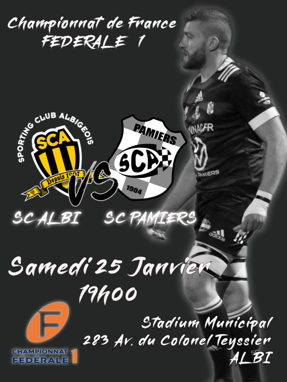Où ? Stadium d’Albi. Quand ? Aujourd’hui à 19 heures. Arbitre de champ : M. Rémy Charleroi. Juges de touche : MM. Matthieu Flores et Benoît Lapassade. Représentant fédéral : M. Serge Marmitte. Superviseur fédéral : M. Christian Zidel.SC ALBI. 1er ; 68 points en 14 matches (13v, 0n, 1d) ; 12 points de bonus (11 offensifs, 1 défensif).SC PAMIERS. 11e ; 22 points en 14 matches (3v, 1n, 10d) ; 4 points de bonus (4 défensifs).