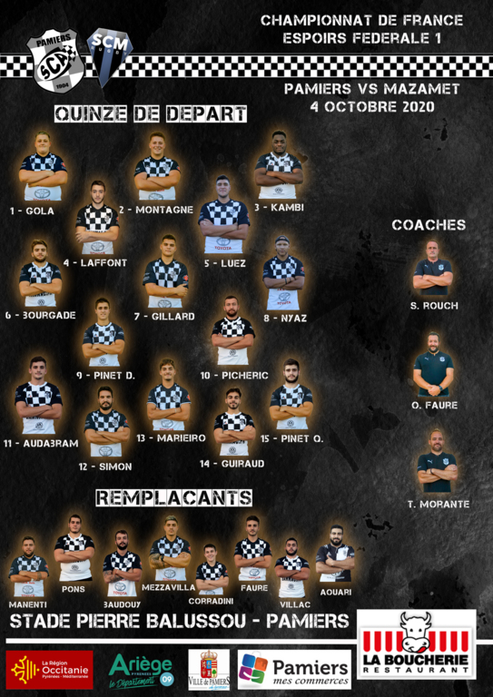 SC PAMIERS. Gola, Montagne, Fournier ; Mezzavilla, Laffont ; Lagrange, Nyaz, Gillard ; D. Pinet (m), Picheric (o) ; Tyrode, Simon, Mariero, Guiraud ; Q. Pinet. Sont entrés en jeu : Manenti, Kambi, Luez, Dejean-Sarradin, Faure, Audabram, Martins, Peuch.