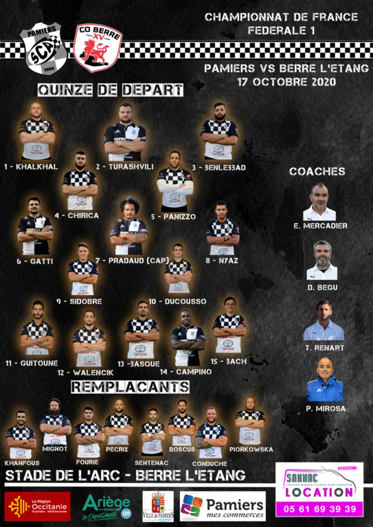 Où ? Stade de l’Arc, terrain d’honneur, à Berre l’Etang.Quand ? Aujourd’hui à 18heures.Arbitre de champ : M.Benoît Mounier.Arbitres de touche : MM. Jérôme Quesnel et Sébastien Rodrigues.Représentant fédéral : M.Gwenael Le Jaouen.Superviseur fédéral : M.Hervé Gilard.CO BERRE XV.5e; 4 points en 2 matches (1v, 0n, 1d).SC PAMIERS.3e; 8 points en 2 matches (2v, 0n, 0d).