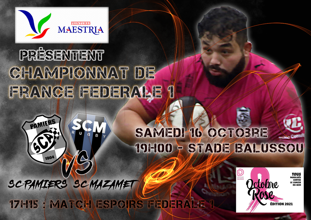 Où ? Stade Pierre Balussou à Pamiers. Quand ? Aujourd’hui à 19 heures (équipe espoirs à 17h15). Arbitre de champ : M. Ludovic Sacarot. Arbitres de touche : MM. Anthony Diaz et Pierre Alquier. Représentant fédéral : M. Gérard Mondin. Superviseur fédéral : M. Christophe Berdos.SC PAMIERS. 2e ; 16 points en 5 matches (4v, 0n, 1d).SC MAZAMET. 8e ; 8 points en 5 matches (2v, 0n, 3d).