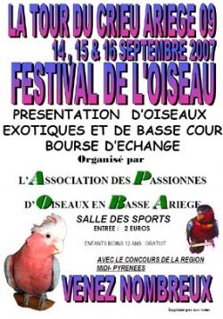 L'Association des Passionnés d'Oiseaux de la Basse Ariège organise à La Tour du Crieu les 14, 15 et 16 septembre une exposition d'oiseaux qui vous feront rêver au bush australien, la fôret amazonienne ou à la brousse africaine.